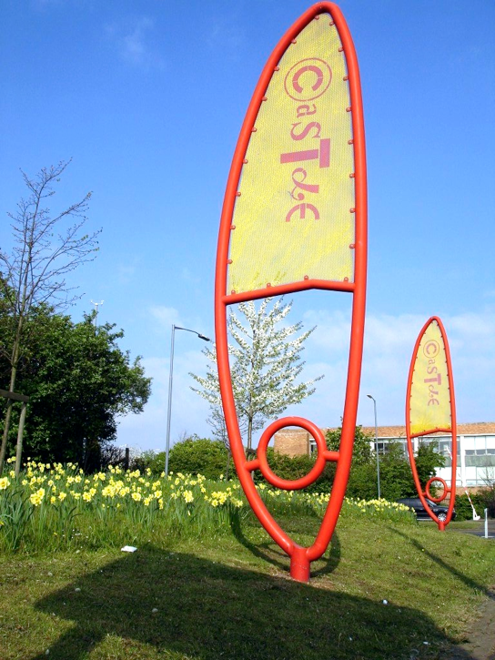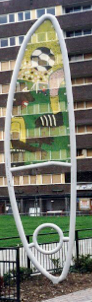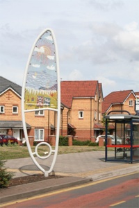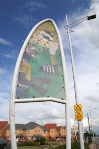 Many residents expressed a wish to see the boundaries of the estate marked in some way. At the same time people were keen to see the Spitfire commemorated in some way as the estate had been a test airfield for the plane during World War II. The Wing banner structural designs were developed as a result of these discussions and were based on the distinctive profile of the spitfire wing whilst at the same time making reference to flight and feathers. The perforated steel inserts were designed to allow positive images of the estate to be designed and painted by residents. The resulting images are highly colourful and show exciting alternative aspects of the people on the estate and the activities that take place.