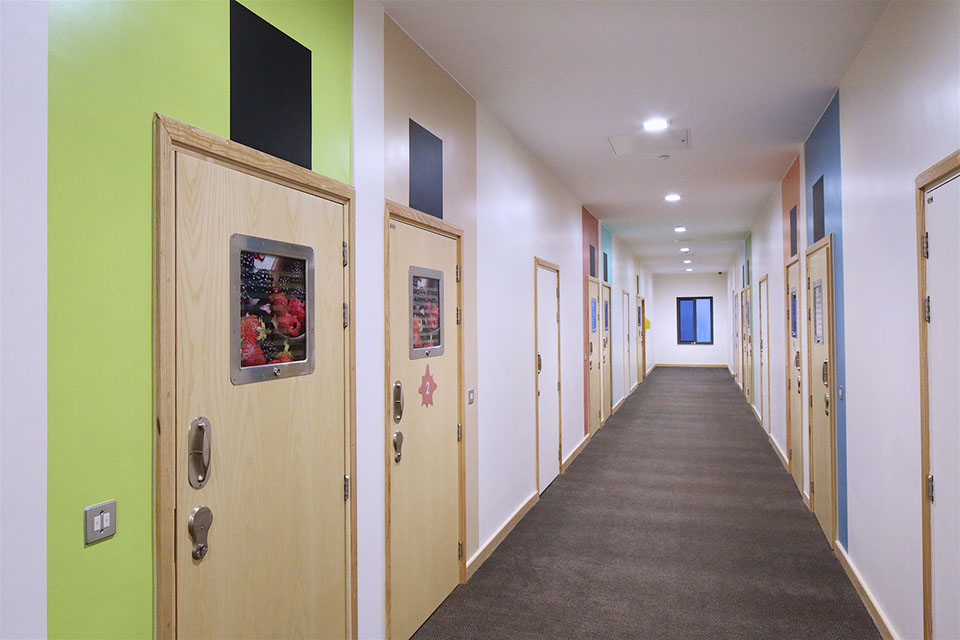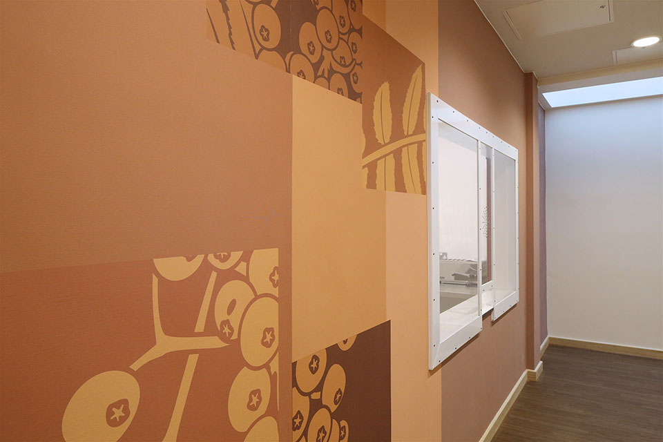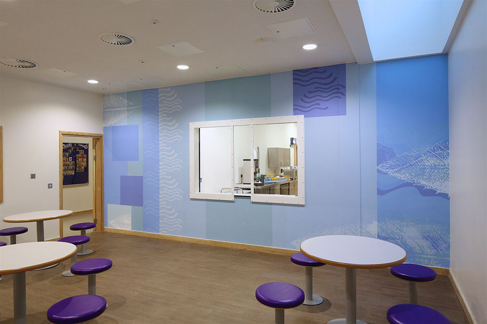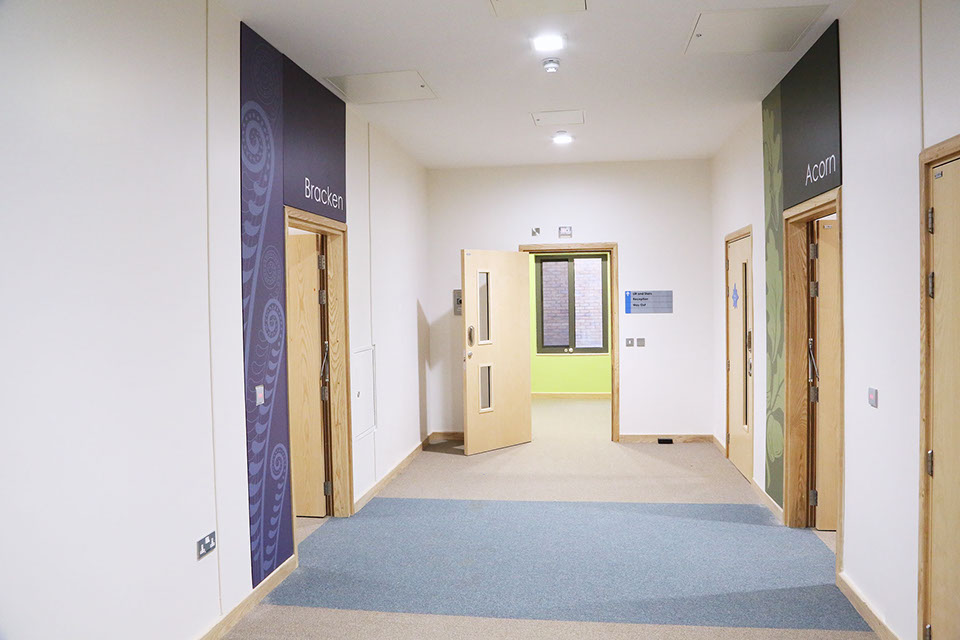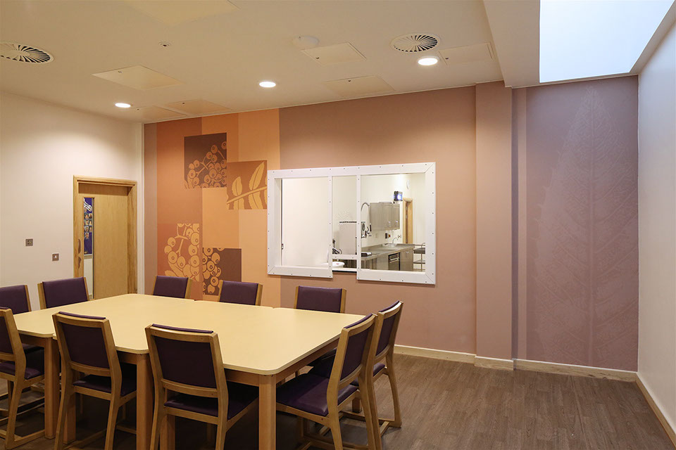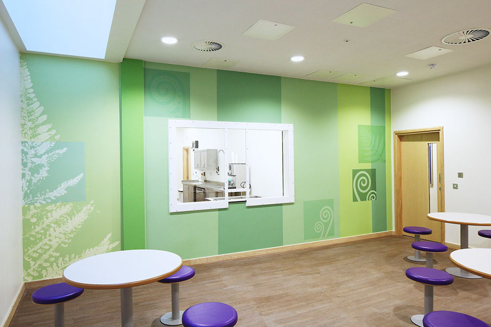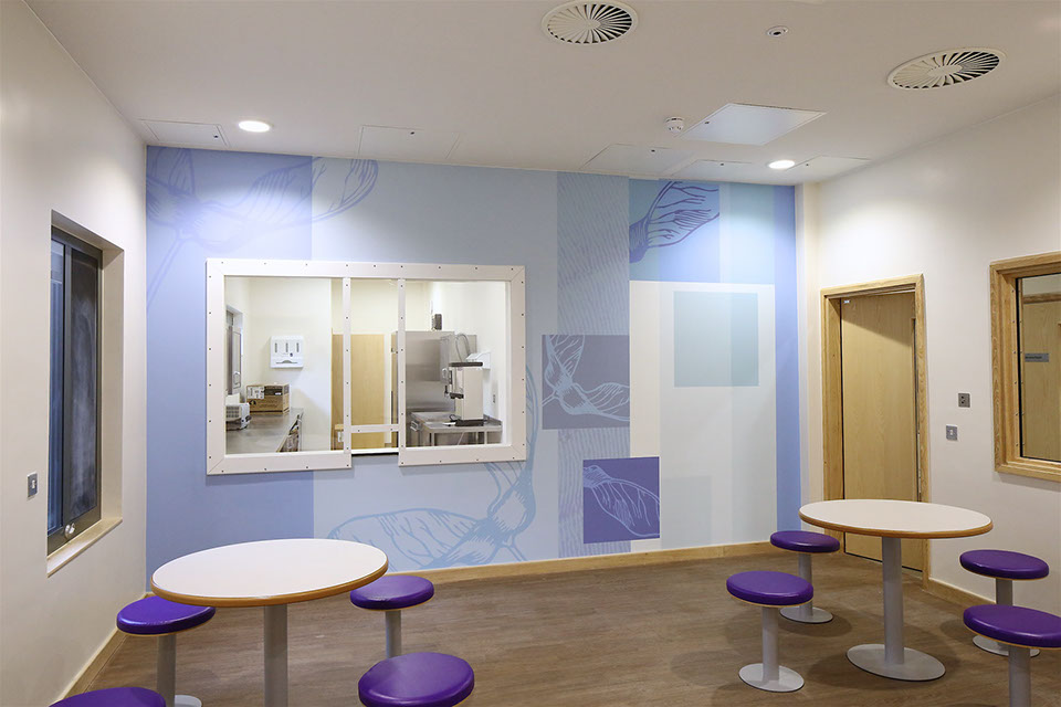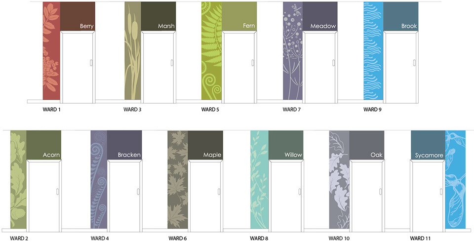 One key element that we took away from this process was the way in which some wards used bands of colours to frame individual bedroom doors particularly for the ASD spectrum patients. We used this as a starting point to develop unique designs that gave each ward a distinct identity with a name such as Acorn (relating to the the overall natural theme) which in turn dictated the use of the relevant graphic which was then deployed at the ward entrance off the main circulation, the bedroom ensuites, staff base manifestation and the dining room wall coverings.