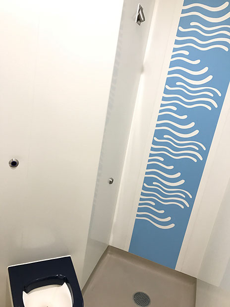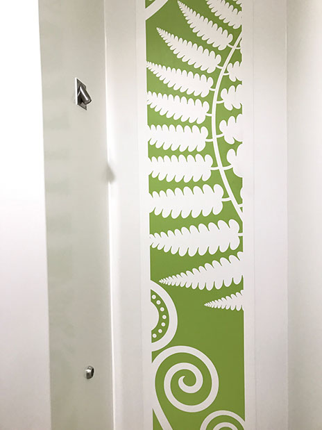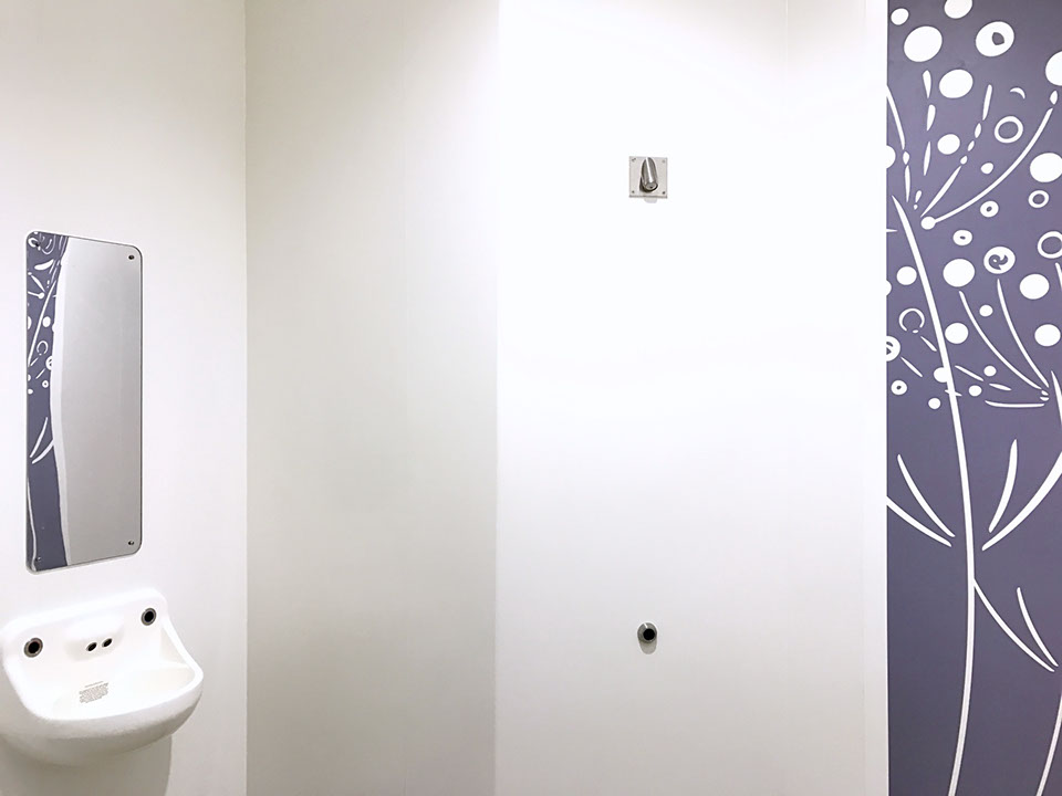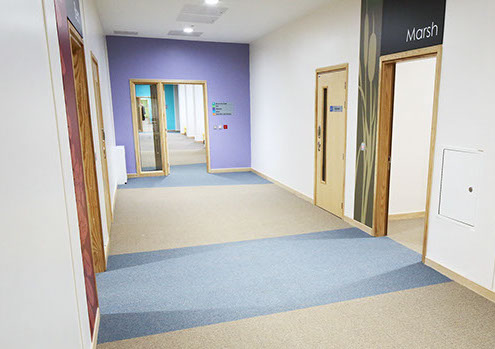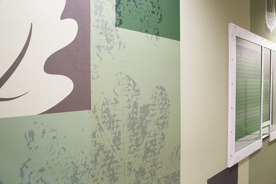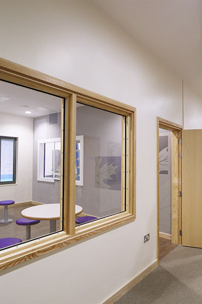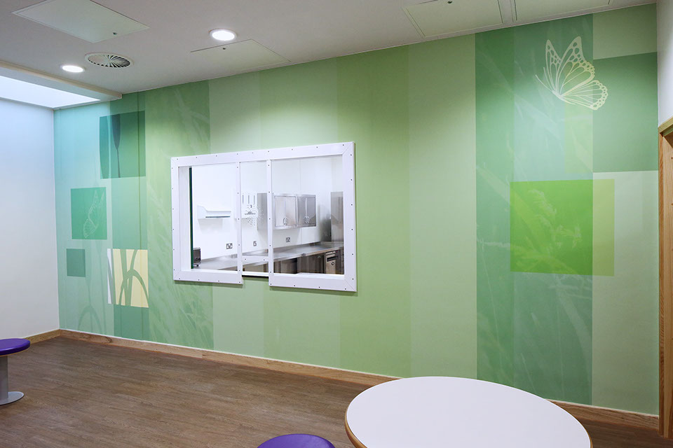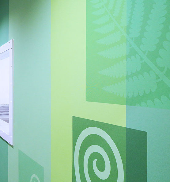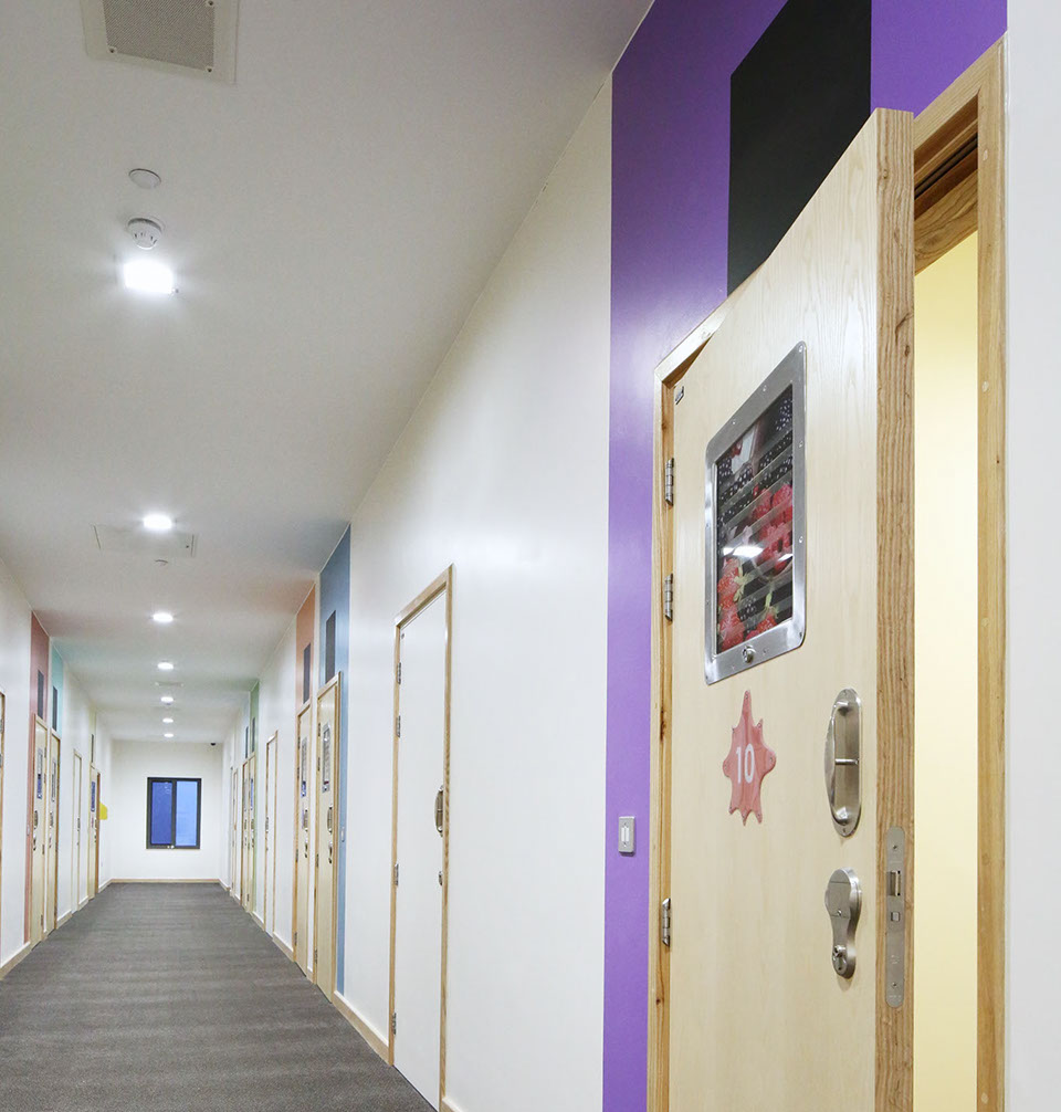 One key element that we took away from this process was the way in which some wards used bands of colours to frame individual bedroom doors particularly for the ASD spectrum patients. We used this as a starting point to develop unique designs that gave each ward a distinct identity with a name such as Acorn (relating to the the overall natural theme) which in turn dictated the use of the relevant graphic which was then deployed at the ward entrance off the main circulation, the bedroom ensuites, staff base manifestation and the dining room wall coverings.