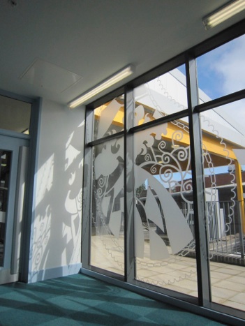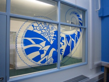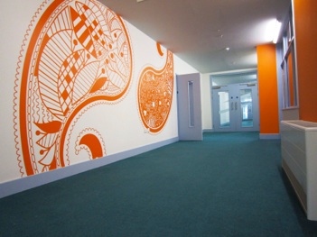 Pupils worked with the artist to develop original paisley patterns which were then turned into vector artwork. Each pattern was coloured according to the curriculum zone and located on circulation walls and on glazing screens for each classroom.