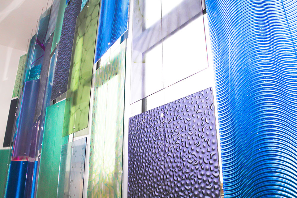 The panels themselves are a mixture of either 3Form resin panels with various textures and interleaved colours or clear acrylic panels with optically clear printed film applied to one side. When the sun light catches the panels the whole room is suffused with glowing squares of colour.