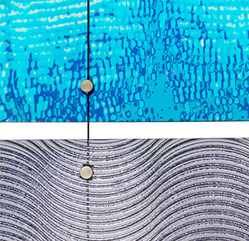 Each panel measures W600 x H1500 x 6mm suspended on 3mm cables from floor to ceiling. The whole assembly is over 9 metres wide by 6.5 metres high - very impressive when you see it close up.