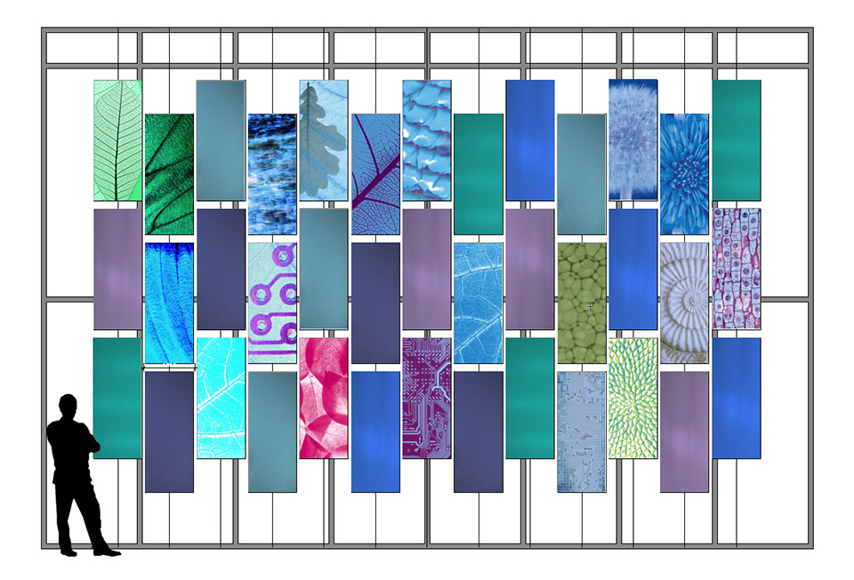 A series of suspended screens were developed for the scheme. Inspiration for the screen arrangement came from observation of microscopy images of cell structures particularly those images of butterfly wings. Various ecological surveys of local woods including Weekly Hall Wood have shown that they have been excellent places to find butterflies.