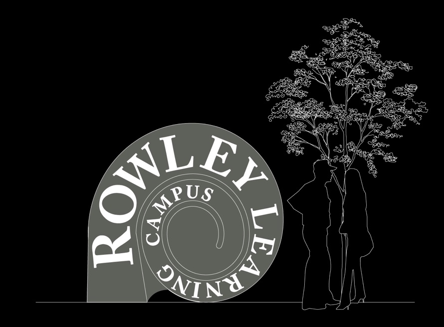 The Rowley Spiral will be constructed out of mild steel and powder coated. Standing approximately 2 metres tall, the spiral structure tapers towards the open end of the form. Profiled 10mm lettering displays the legend 'Rowley Learning Campus'. The Spiral will be located at the start of the avenue leading towards the main entrance.