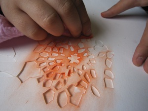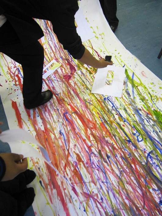 We planned to get the project kick started with some 'stretching' art exercises designed to loosen up any inhibitions the pupils might feel. So out came the big roll of paper and brushes taped to withies for the first experiment - mark making using only lines and diluted acrylic paints. A slightly nervous start soon turned into exuberant painting with pupils really getting into the process.